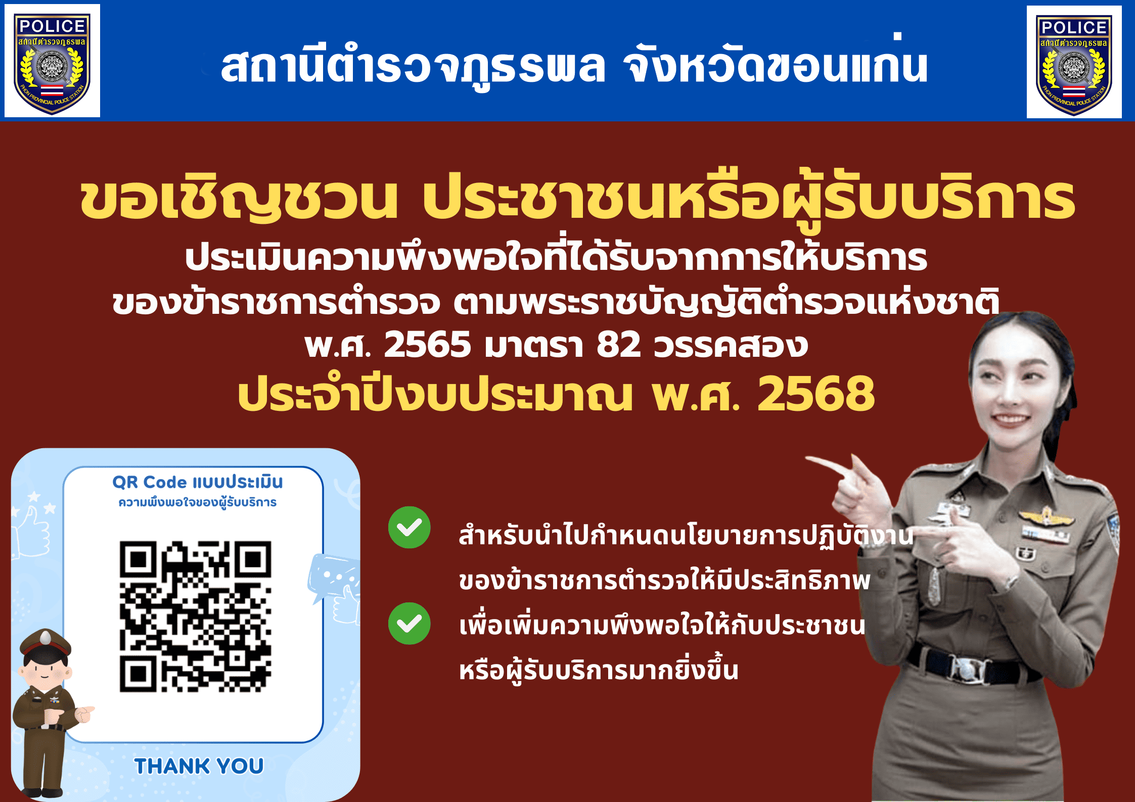 ประเมินความพึงพอใจ 6 พฤษภาคม 2568 โดย admin / ข่าวประชาสัมพันธ์ ขอเชิญประเมินความพึงพอใจ การได้รับบริการจากข้าราชการตำรวจ FacebookFacebookXXLINELine