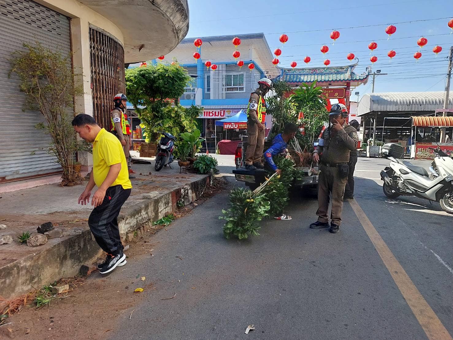 พล62 605 618 622 ว.4 ว.10 ร่วมเจ้าหน้าที่เทศกิจ ที่ ถนนข้าง รร.ฉัตรชัย หน้าโรงงิ้ว มีต้นไม้บนผิวถนน ประสานเจ้าของบ้านเอาขึ้นพ้นผิว เพื่อความปลอดภัยในการใช้รถใช้ถนน ด้วยความปลอดภัย