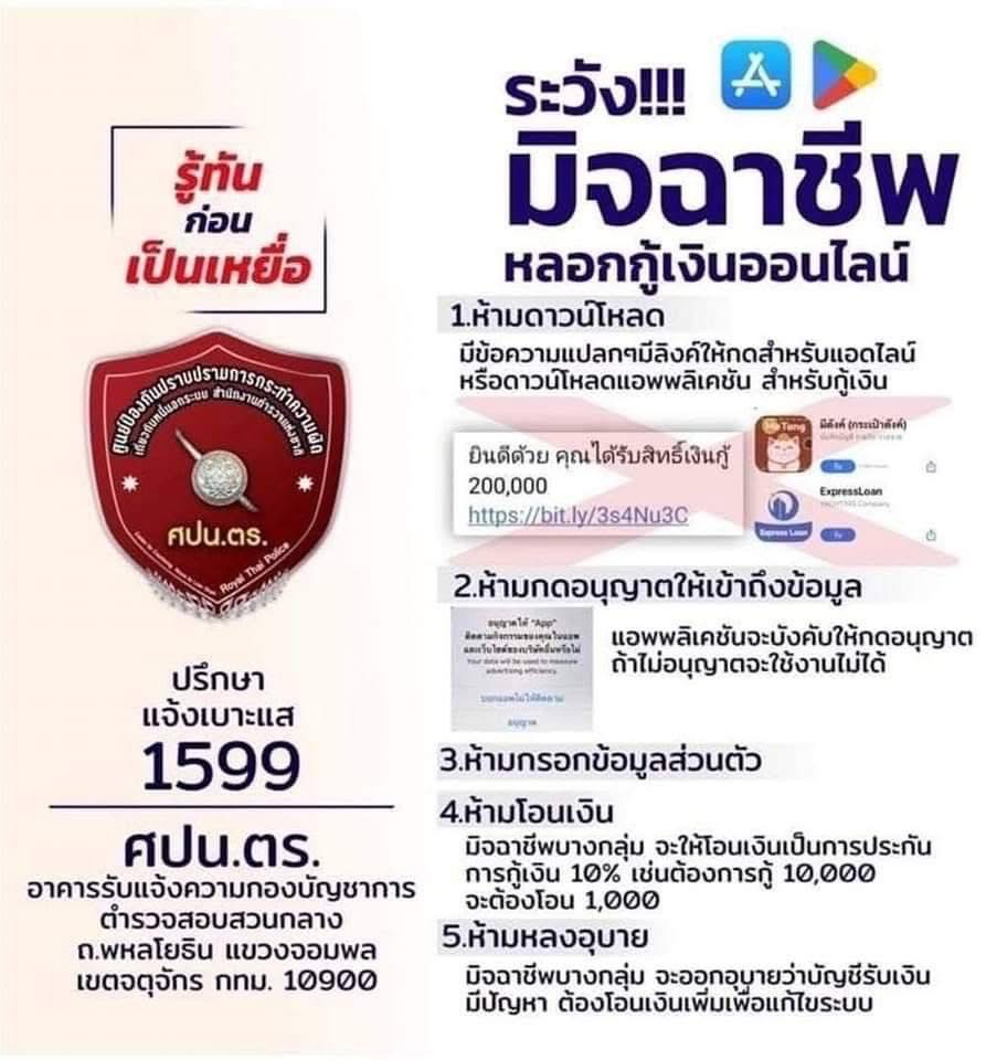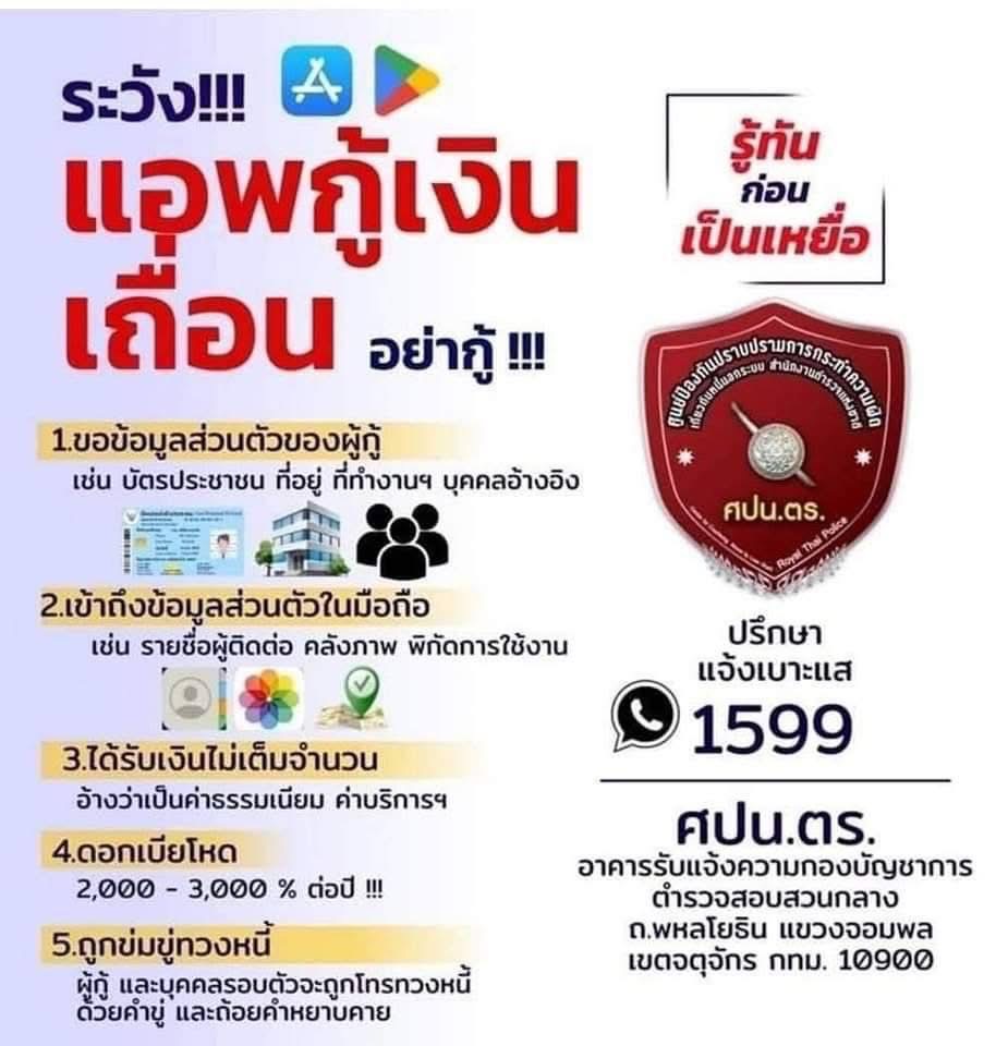 !เตือนภัย! 26 ธันวาคม 2567 โดย admin / ข่าวประชาสัมพันธ์ #ระวังมิจฉาชีพ #หลอกกู้เงินออนไลน์ #แอพเงินกู้เถื่อน และ #การป้องกันการยืมเงินนอกระบบ FacebookFacebookXXLINELine